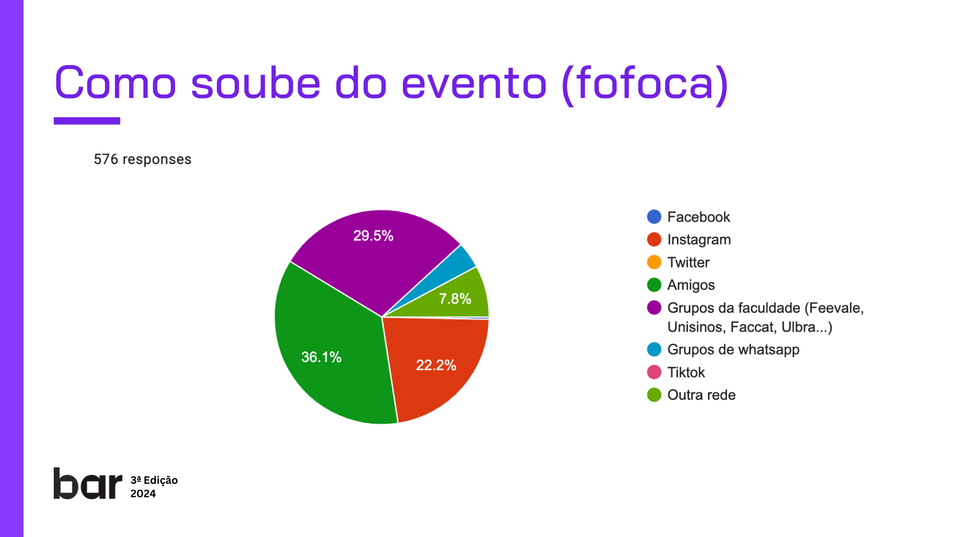 A Edição 2024, realizada nos dias 27 e 28 de setembro na Universidade Feevale, reuniu 524 participantes, vindos de mais de 30 cidades, com apoio de 30 voluntários, 18 palestrantes e 10 patrocinadores.